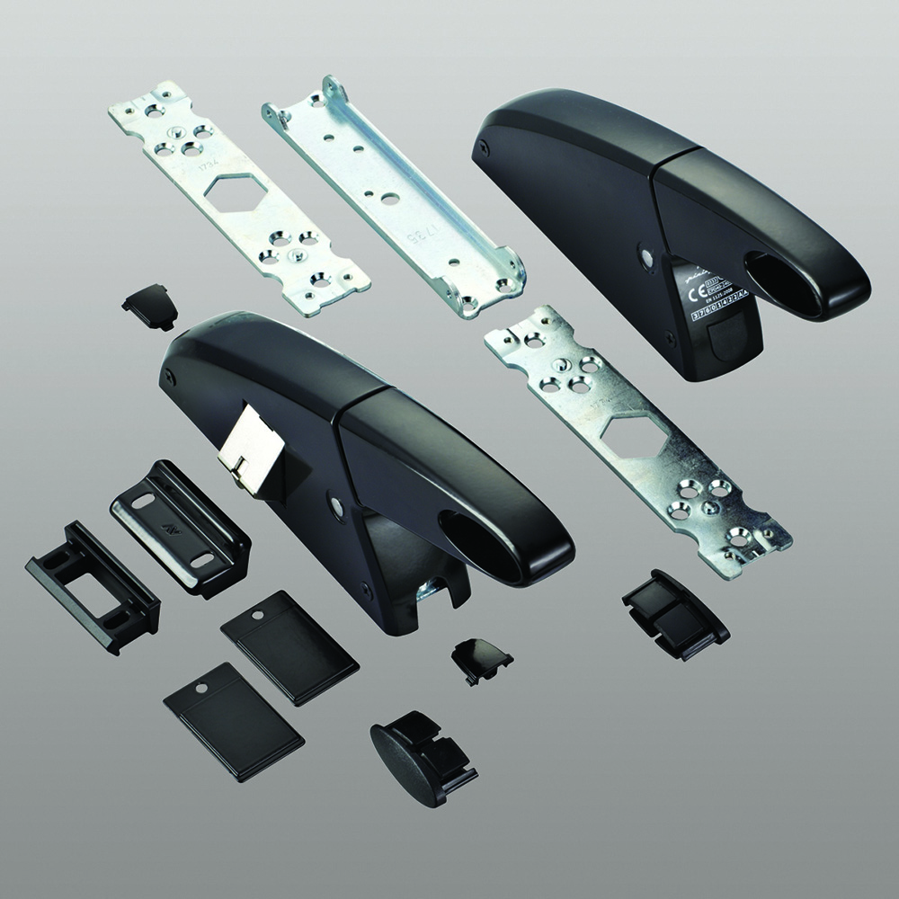 (pat.) Bausatz seitliche Halterungen beidseitig einsetzbar, mit 3 Verriegelungspunkten, aus lackiertem Zink-Druck Guß und verzinktem Stahl. Inhalt: Falle aus vernickeltem Zink-Druck Guß, Befestigungsplatten aus verzinktem Stahl, 1 Verschlussmulde aus lackiertem Stahl, 1 Verschlußabdeckung aus Nylon, Abdeckkappen für rechte und linke Griffstangen-Enden, 8 Senkschrauben Ø 4.2×13 aus verzinktem Stahl, 2 Zylinderschrauben Ø 4.2×19 aus verzinktem Stahl, 16 Senkschrauben M4x5 aus schwarz verzinktem Stahl (9010, GREY und SILV: 8 Senkschrauben M4x5 aus verzinktem Stahl + 8 Senkschrauben M4x6 aus Edelstahl).