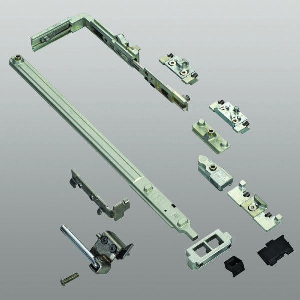 (patented) Left vertical fulcrum Kit with night ventilation, turn-first function, in white galvanized zamak and black nylon, premounted screw in stainless steel 304 and 430, left hinge support in stainless steel 304, left pin in stainless steel 201 with premounted counterplate in stainless steel 430 and pin in galvanized steel, 1 self-forming countersunk head screw M5x18 in stainless steel 304.